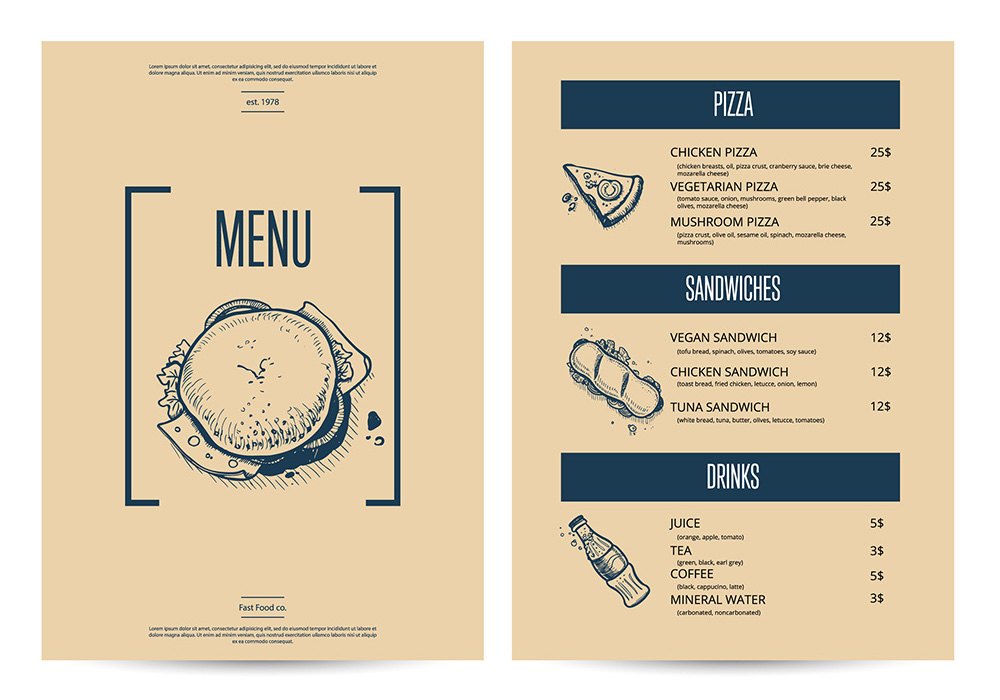 飲食店のメニューは、オススメが一目で伝わること・美味しそうに感じさせることがとても大切です。当社では、各店舗様の雰囲気や魅力を最も引き出せるようなレイアウトを心がけております。